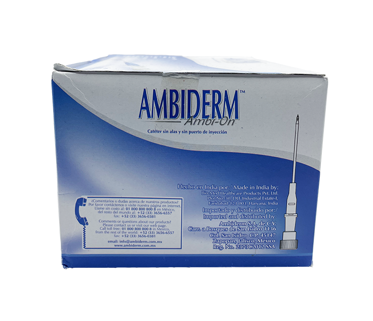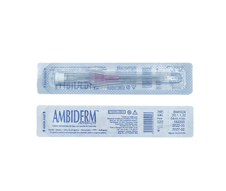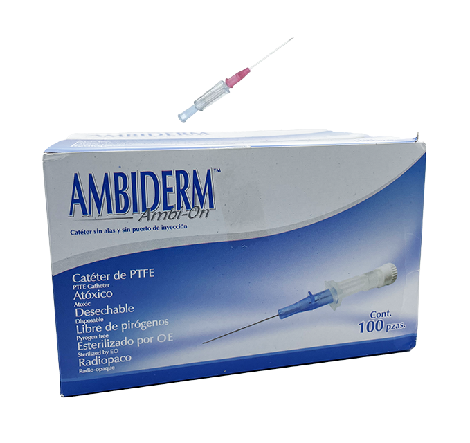 Caja con 100 catéteres 20G (rosa) de marca Ambiderm sin alas y sin puerto de inyección con aguja de acero inoxidable siliconizada con punta tribiselada para una venupción suave, atóxicos y esterilizados por ETO. Están fabricados de politetrafluoretileno, son resistentes y biocompatibles. Su diseño de superiores extremadamente lisas permite asegurar una fácil venupción con el mínimo trauma. El precio incluye impuestos, si requieres factura envía un correo a ventas@bacmedical.com.mx con el numero de la venta de tu pedido.