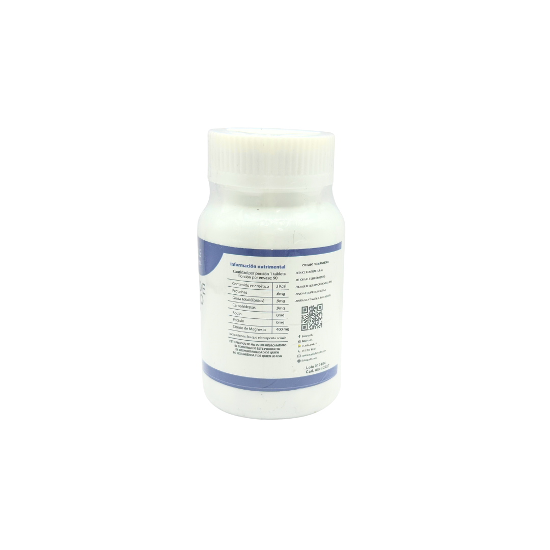 Suplemento alimenticio Citrato de magnesio 400 mg de marca Balancells con 90 tabletas. La dosis sugerida es la que tu médico o terapeuta indique. El precio incluye impuestos, si requieres factura envía un correo a ventas@bacmedical.com.mx con el numero de la venta de tu pedido