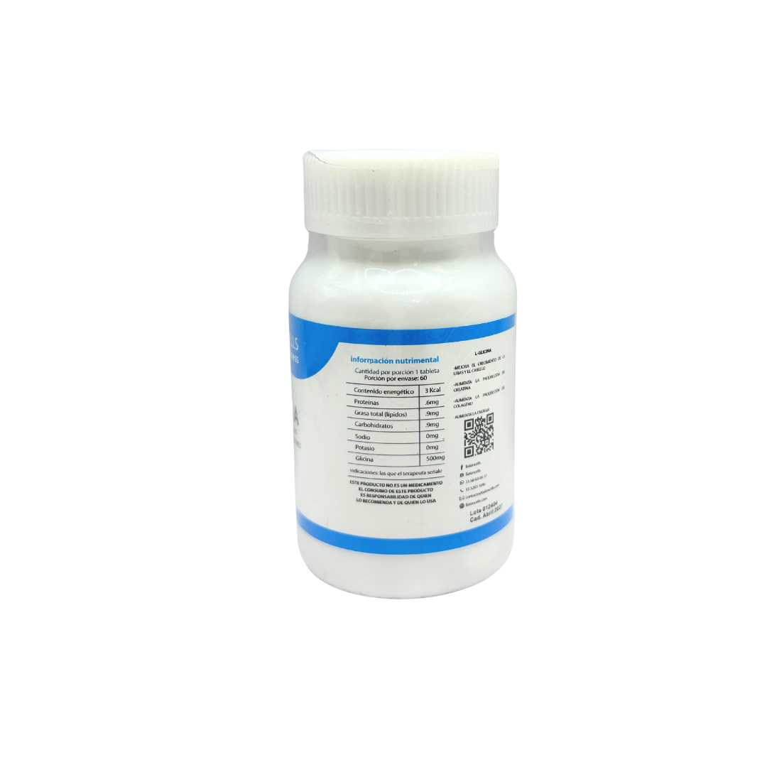 Suplemento alimenticio Glicina 500 mg de marca Balancells con 60 tabletas. La dosis sugerida es la que tu médico o terapeuta indique. El precio incluye impuestos, si requieres factura envía un correo a ventas@bacmedical.com.mx con el numero de la venta de tu pedido.