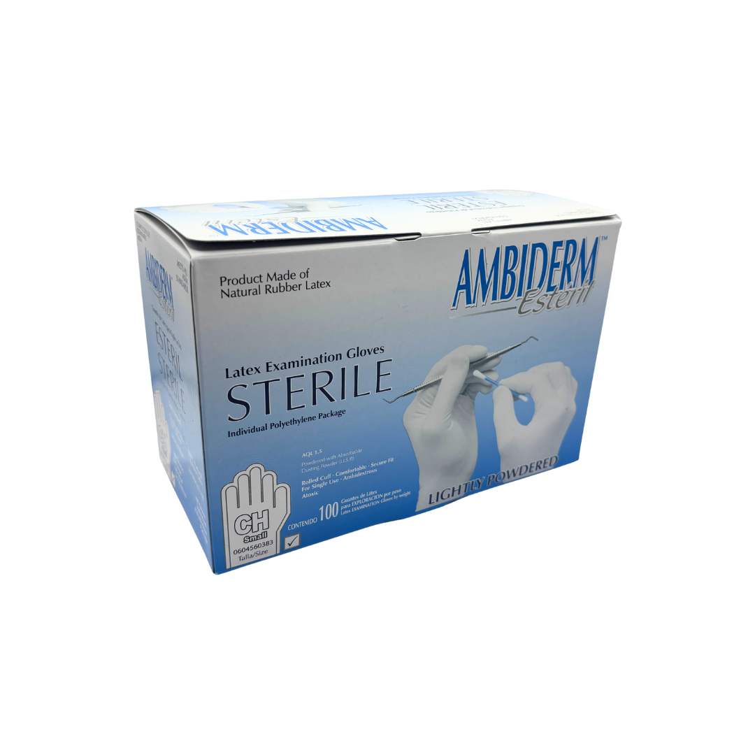 Caja con 100 piezas de guantes de látex estériles de color natural Ambiderm talla chica bajos en polvo para exploración, ambidiestros , diseño anatómico, ajuste perfecto, confortable y acabado liso. Son resistentes a productos químicos (ácidos, álcalis y alcoholes diluidos). El precio incluye impuestos, si requieres factura envía un correo a ventas@bacmedical.com.mx con el numero de la venta de tu pedido.