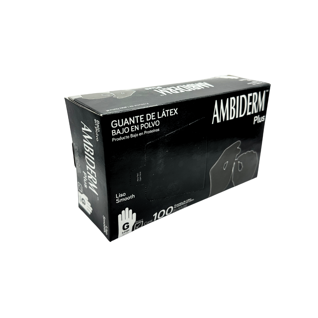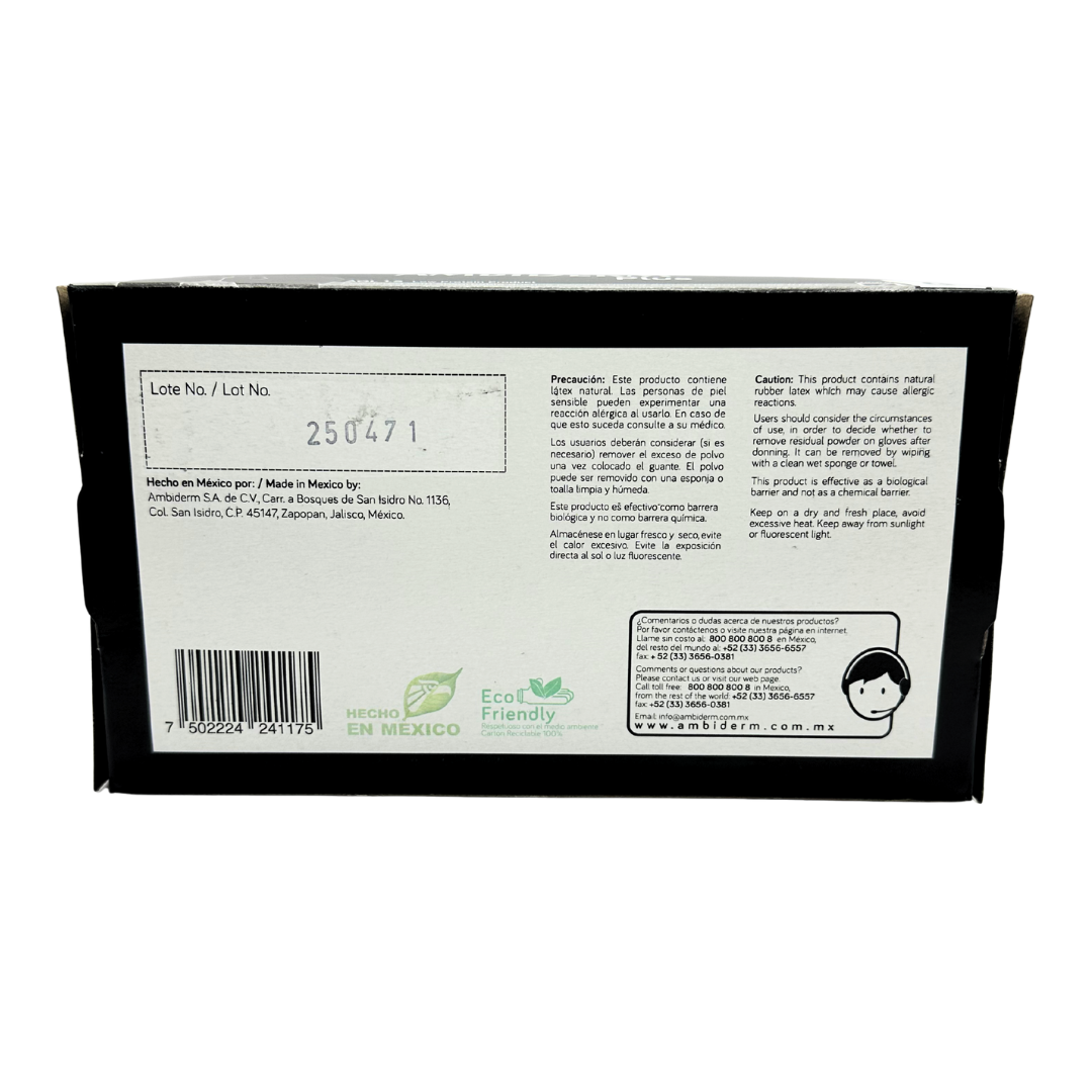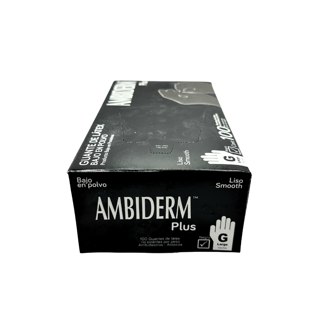 Caja con 100 piezas de guantes de látex negro Ambiderm talla grande no estériles, ambidiestros, certificados, bajos en polvo para exploración, con acabado liso, ajuste perfecto y confortable. Son resistentes a productos químicos (ácidos, álcalis y alcoholes). Caja con 100 piezas. El precio incluye impuestos, si requieres factura envía un correo a ventas@bacmedical.com.mx con el numero de la venta de tu pedido.