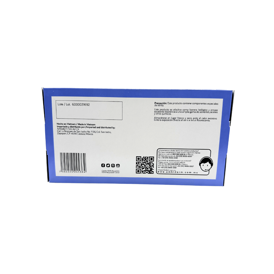 Caja con 100 piezas de guantes de nitrilo violeta Ambiderm en talla chica libres de polvo, ambidiestros, con ajuste perfecto, confortable y con las yemas texturizadas para tener mejor agarre del instrumental. Resistente a productos químicos (ácidos, álcalisis y alcoholes). . El precio incluye impuestos, si requieres factura envía un correo a ventas@bacmedical.com.mx con el numero de la venta de tu pedido.