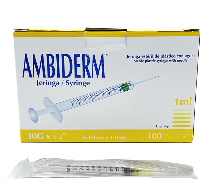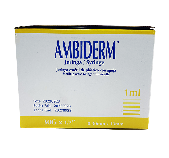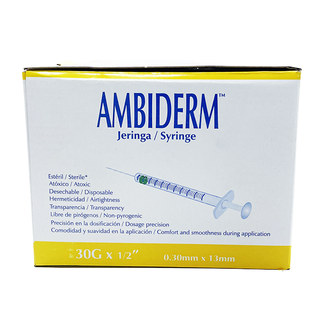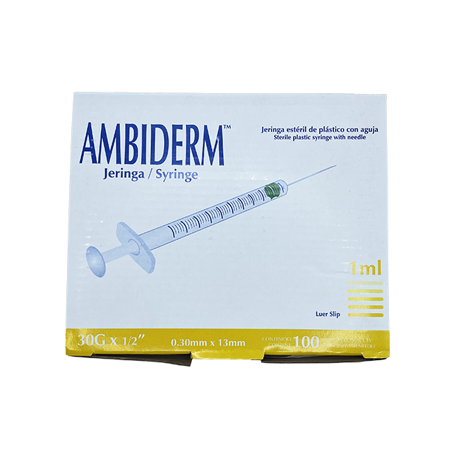 Caja con 100 jeringas de 1 ml con aguja 30 G x 13 mm (color amarilla) tribiselada para el mínimo trauma y desmontable (Luer slip) de marca Ambiderm. El precio incluye impuestos, si requieres factura envía un correo a ventas@bacmedical.com.mx con el numero de la venta de tu pedido.