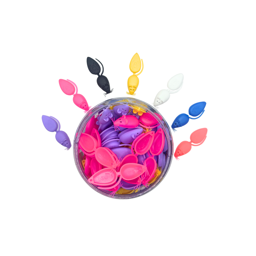 Bote con 100 ratones para guardar dientes de colores surtidos (Rosa claro, Rosa mexicano, Lila, Azul, Amarillo, Blanco y Negro). El precio incluye impuestos, si requieres factura envía un correo a ventas@bacmedical.com.mx con el numero de la venta de tu pedido.